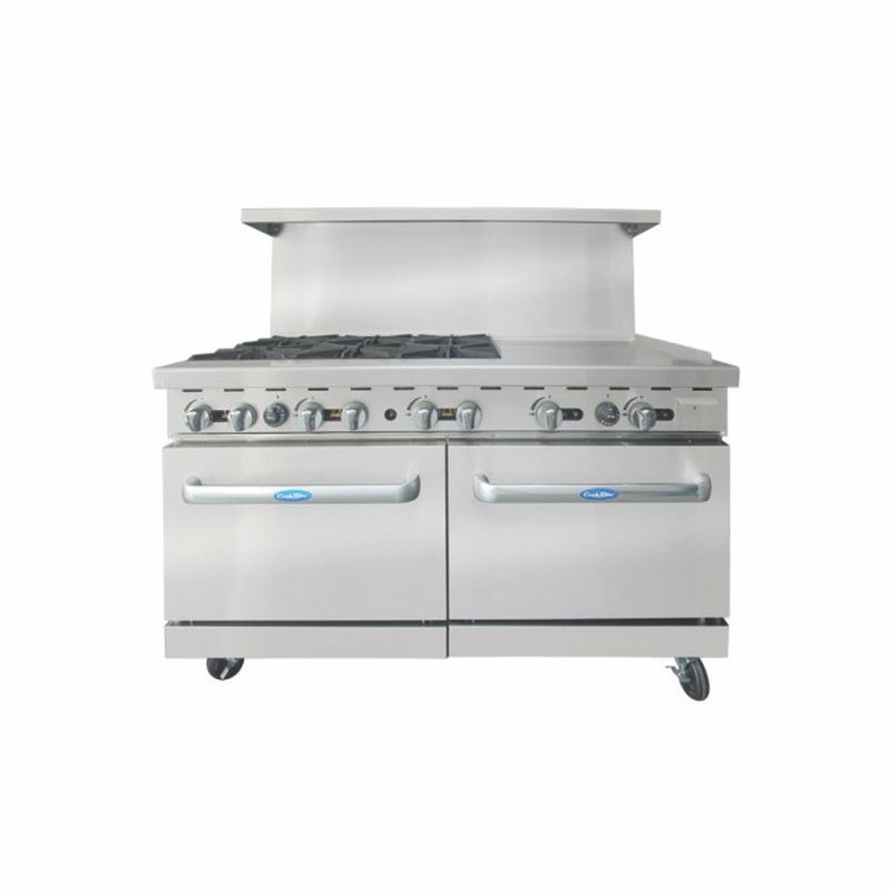 CookRite Range, Natural gas, 60″W x 31″D x 57-3/8″H, (6) 32,000 BTU open burners with standing pilots, (1) 24″W 3/4″ think polished steel griddle on the right, (2) 26-1/2″W oven, oven pilot with safety shut off, (4) adjustable chrome oven rack, drip tray, stainless steel front, back sides, kick plate, back guard & over shelf, casters, 294,000 total BTUs, cETL, ETL-Sanitation