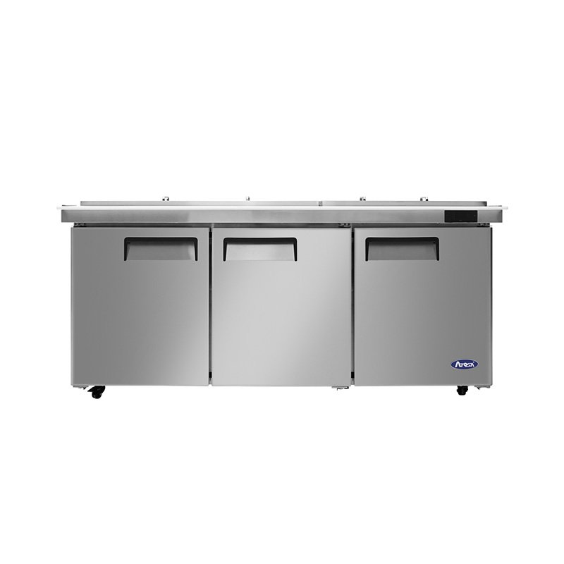 The Atosa MSF8304GR is a three-section Mega Top prep table featuring a durable stainless steel interior and exterior with 21.1 cu. ft. of storage. This 72.7-inch wide unit includes thirty 1/6 size pans, a 9-1/4″ poly cutting board, and a specialized airflow system that maintains precise temperatures between 33°F and 40°F. Powered by an eco-friendly R290 rear-mount compressor, it features self-closing doors, adjustable shelving, and pre-installed casters for efficient commercial performance.