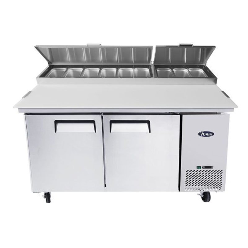 The Atosa 67 inch Refrigerated Pizza Prep Table is built for high-volume prep, keeping ingredients organized, accessible, and safely chilled throughout service. Its stainless steel exterior and interior provide long-lasting durability with a clean, professional finish. Equipped with a side-mounted compressor using environmentally friendly R290 refrigerant, this unit runs efficiently while the electronic temperature controller maintains consistent temperatures between 35°F and 38°F for optimal food safety. The spacious prep area includes stainless steel 1/3 size pans and a 19-1/4 inch cutting board, giving you everything you need to assemble pizzas, sandwiches, and more with ease. Self-closing doors with a stay-open feature support a smooth workflow, while recessed handles and magnetic door gaskets ensure a secure seal. Inside, two pre-installed shelves per section offer organized storage, and pre-installed casters make the unit easy to move for cleaning and repositioning.