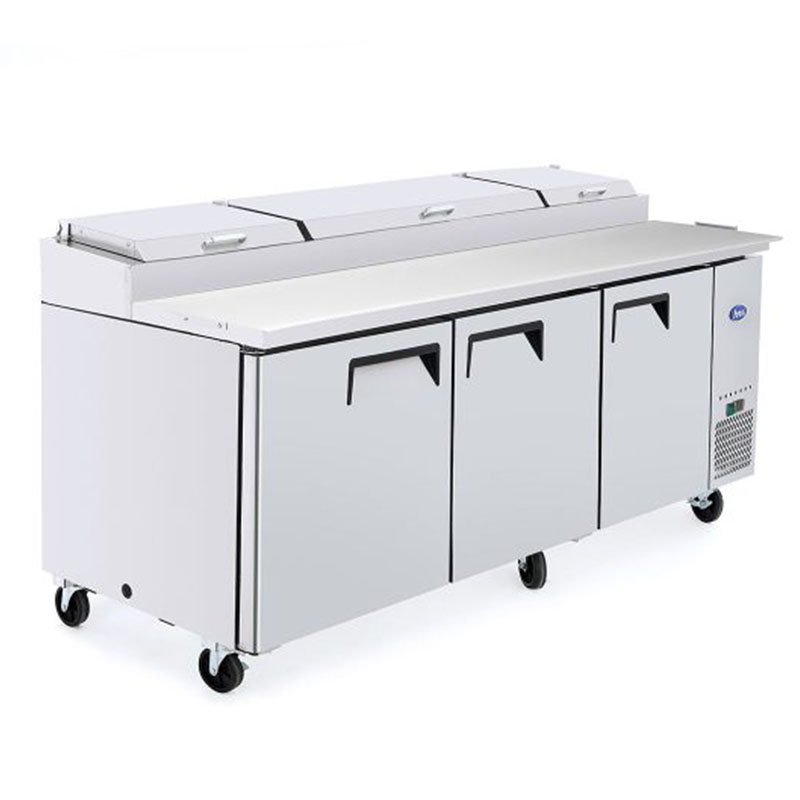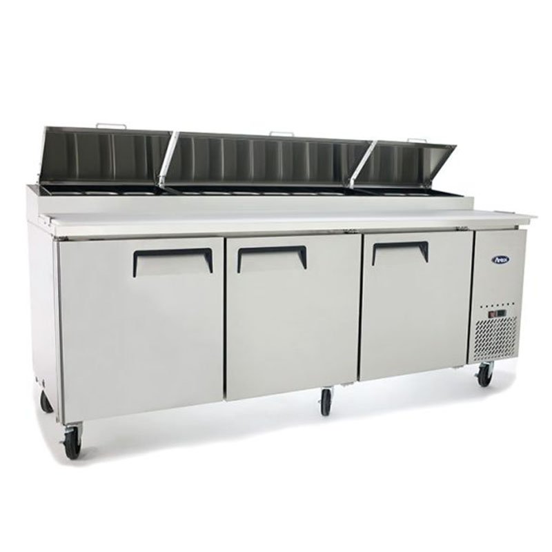 The Atosa 93 inch Refrigerated Pizza Prep Table is built for maximum prep capacity and efficiency in high-demand kitchens. With a stainless steel exterior and interior, it offers durability and a clean, professional look that stands up to daily use. A side-mounted compressor with environmentally friendly R290 refrigerant ensures efficient operation, while the electronic temperature controller maintains consistent temperatures between 35°F and 38°F for safe ingredient storage. Designed for speed and organization, this unit includes stainless steel 1/3 size pans and a 19-1/4 inch cutting board, keeping toppings and prep space within easy reach. Self-closing doors with a stay-open feature support a smooth workflow during busy shifts, while recessed handles and magnetic door gaskets provide a secure, energy-efficient seal. Two pre-installed shelves per section help keep ingredients organized, and standard casters allow for easy mobility and cleaning.