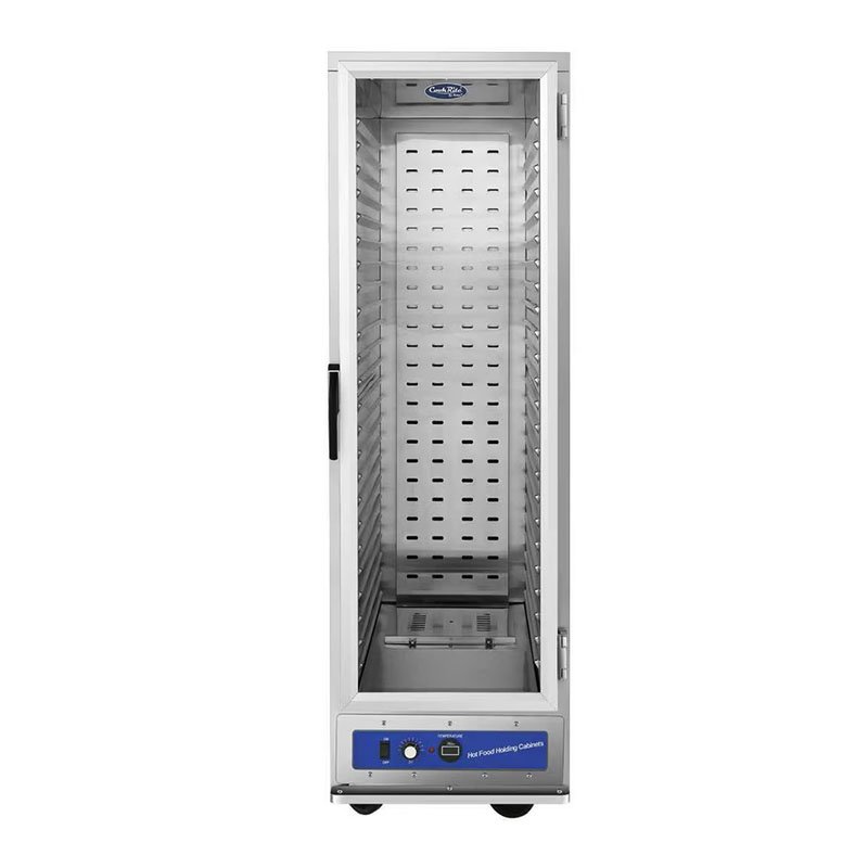 CookRite Economy Warming & Holding Cabinet, insulated, 21-1/2″W, accommodates (24) 18 x 26 pans, (1) transparent polycarbonate door with remain open feature, heating mode with 80°F – 185°F temperature range, dial controls, LED display, water tray, integrated slides, removable control drawer, stainless steel interior & exterior, (2) swivel casters & (2) locking casters, 1.58kW, 120v/60/1-ph, cord, cETLus, ETL-Sanitation