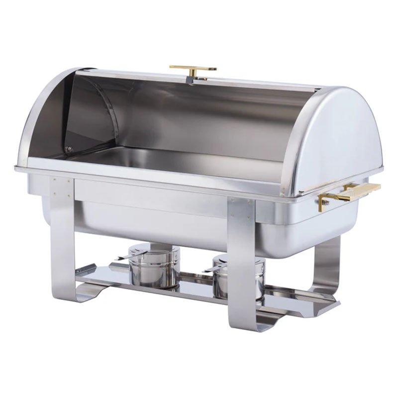 Dallas Chafer, 8 qt., full size, rectangular, roll top, stainless steel with gold accents, includes food pan, water pan, and fuel holders, mirror finish