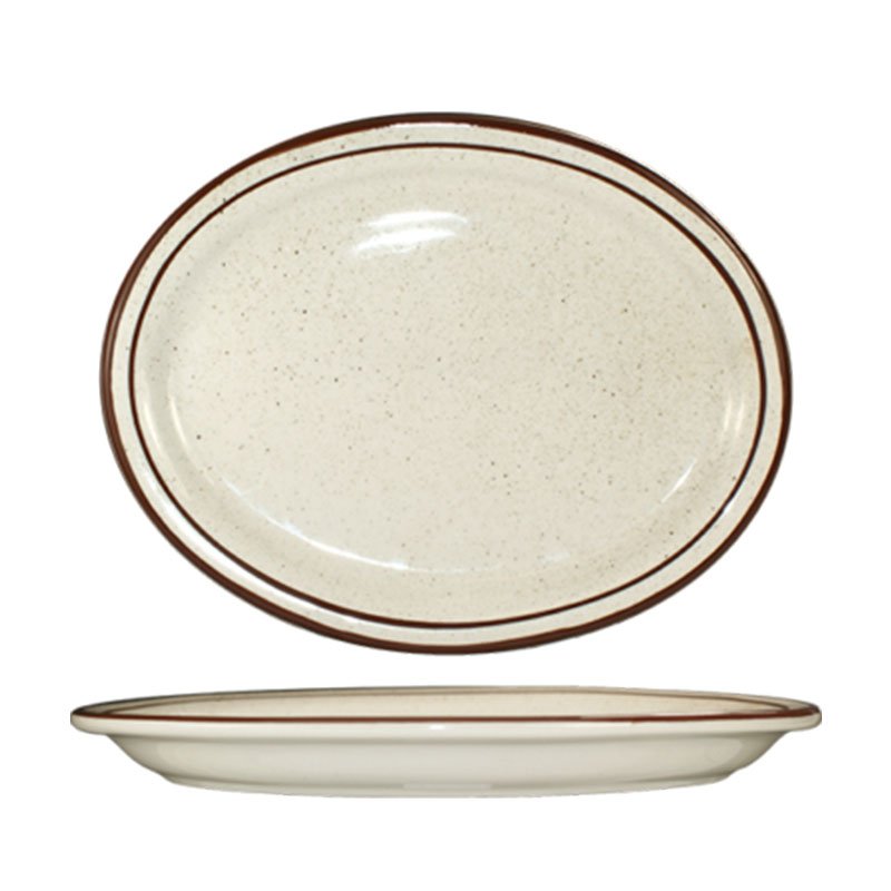 Platter, 13-1/4″ x 10-3/8″, oval, narrow rim, microwave & dishwasher safe, lead free, ceramic, American White with Brown speckle & rim, Granada™
