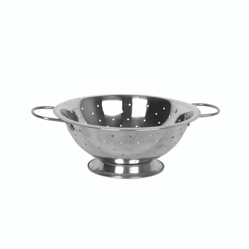 Colander, 13 quart capacity, round, perforated, footed base, dual side handles, stainless steel, mirror finish