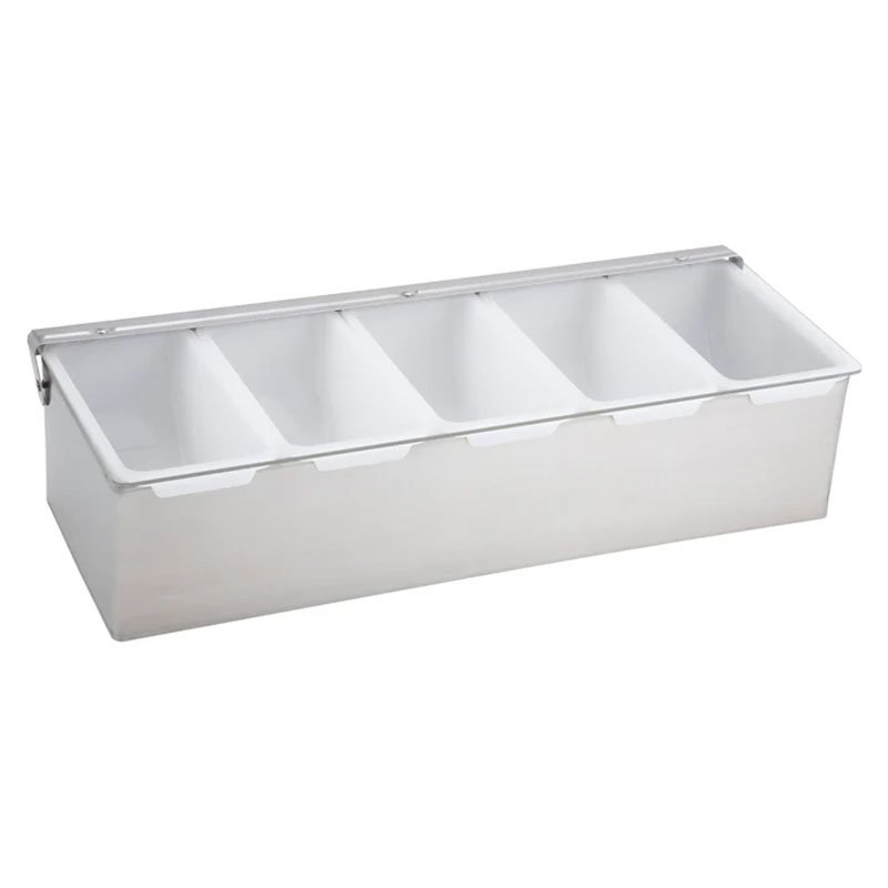 - 5 white plastic removable inserts with curved bottom for easy cleaning