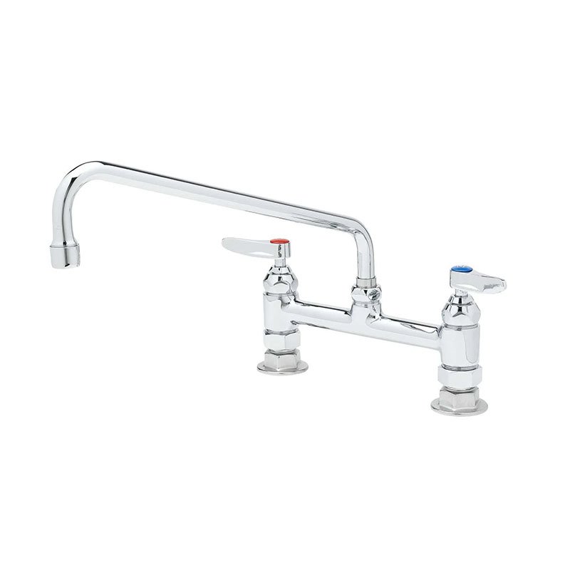 8″ deck mount mixing faucet with polished chrome plated brass body, 12″ swing nozzle with stream regulator outlet, compression cartridges with spring checks, lever handles and 1/2″ NPT female inlets. Certified toASME A112.18.1/CSA B125.1, NSF 61-Section 9 and NSF 372. Meets ADA ANSI/ICC A117.1 requirements.