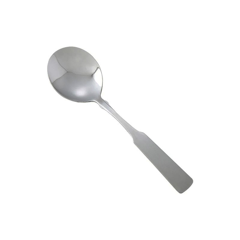 The Winco Houston Bouillon Spoon is a 6.75-inch professional utensil featuring a shallow, contoured bowl specifically designed for enjoying soups, broths, and side dishes. Part of the Houston collection, it boasts a distinctive fiddle-shaped handle with a turned-out collar and neck, all polished to a high-luster mirror finish that resists pitting and dulling. Built for longevity and ease of maintenance, it is fully approved for both residential and commercial dishwashers.