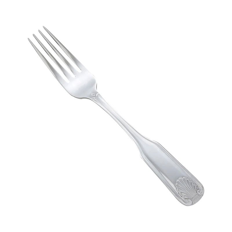 The Toulouse Dinner Fork brings a sophisticated, traditional French aesthetic to the table with its elegant fiddle-shaped handle and shell motif. At 8.5 inches, this oversized fork is balanced for main course service and provides a substantial, premium feel for guests. Although the description mentions 18/8, this specific commercial model is forged from extra heavyweight 18/0 stainless steel, ensuring it is both exceptionally durable and magnetic for easy recovery in silver-saver systems.