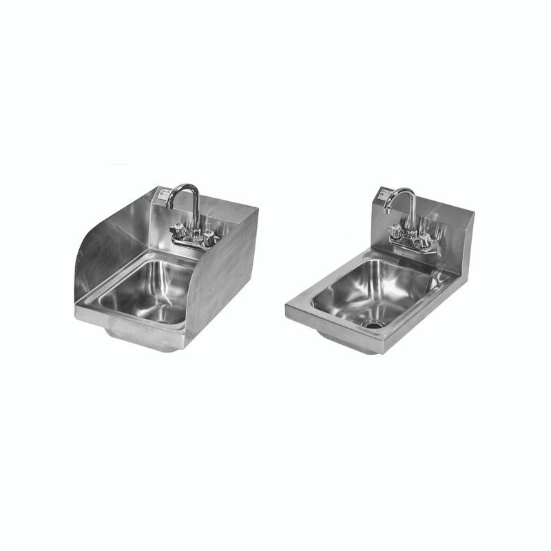 Space Saver Hand Sink, wall mount, 11″W x 13″D, 304 type stainless steel construction, 9″ x 9″ x 4.5″ deep bowl, splash mount gooseneck faucet with wrist handles on 4″ centers, includes basket drain, NSF