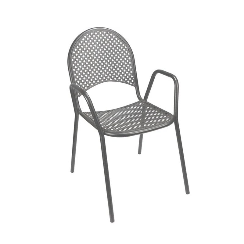 Introduce a cool, contemporary aesthetic to your patio with the Metal Woven Back Outdoor Armchair (Model #90G). Moving away from traditional black, this model features a sleek Grey Powder Coated finish that blends effortlessly with modern urban design and neutral landscapes. The chair is defined by its sophisticated woven-pattern metal backrest, which provides a breathable, ergonomic surface that keeps guests comfortable and ventilated during warm outdoor dining sessions. Engineered with a lightweight yet robust Aluminum base, this 13 lb chair is easy for staff to reposition while offering the heavy-duty strength of a 300 lb weight limit. The integrated armrests add an extra layer of relaxation, making it the ideal choice for lengthy brunches or evening drinks. To ensure a seamless transition for your business, these chairs ship fully assembled, arriving ready for immediate use on your deck or sidewalk café.
