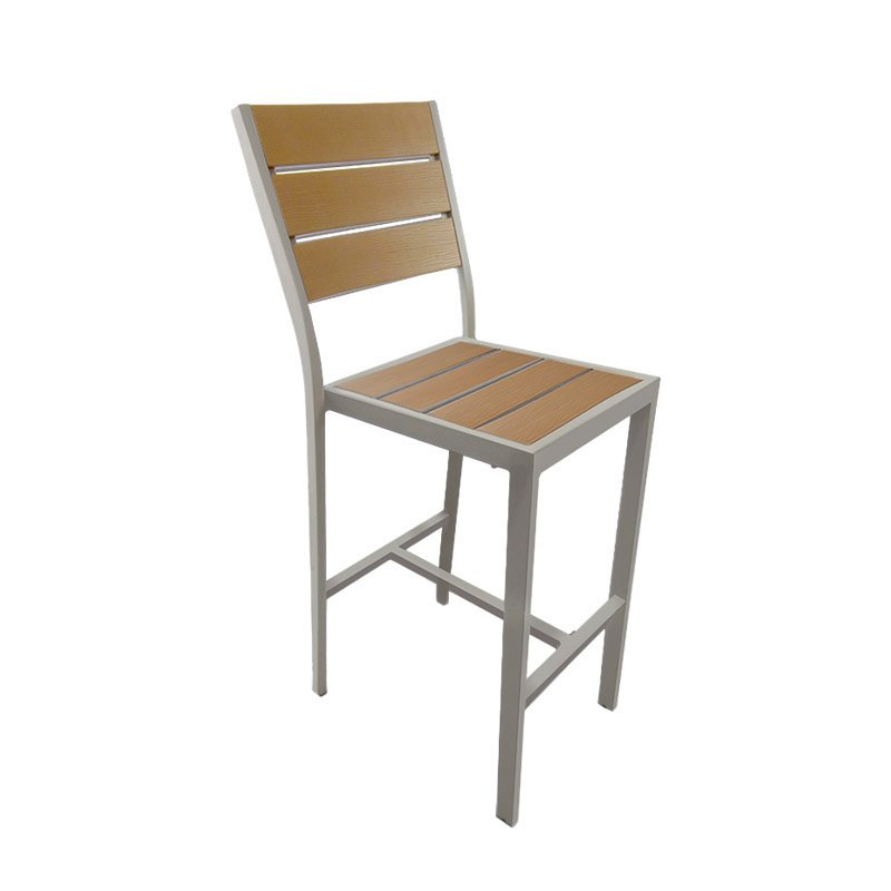 Take your outdoor beverage service to the next level with the Perma-Wood™ Outdoor Barstool (Model #PW80330). This bar-height seating solution perfectly captures the inviting warmth of natural timber with its Tan wood-like slats, featuring a realistic, sealed texture that stands up to sun, rain, and heavy use. Paired with a sophisticated Champagne powder-coated aluminum frame, this stool offers a tonal, high-end aesthetic that is naturally rust-proof and ideal for poolside bars, rooftop lounges, or coastal terraces. Designed for stability and ease of use, this 14lb barstool features a 30″ seat height, making it the perfect match for standard bar-height counters and high-top tables. To ensure structural integrity and safe shipping, the stool is equipped with a field-installed “T-bar” cross base. This reinforcement provides a sturdy footrest and added frame support, ensuring a comfortable and secure experience for your guests.