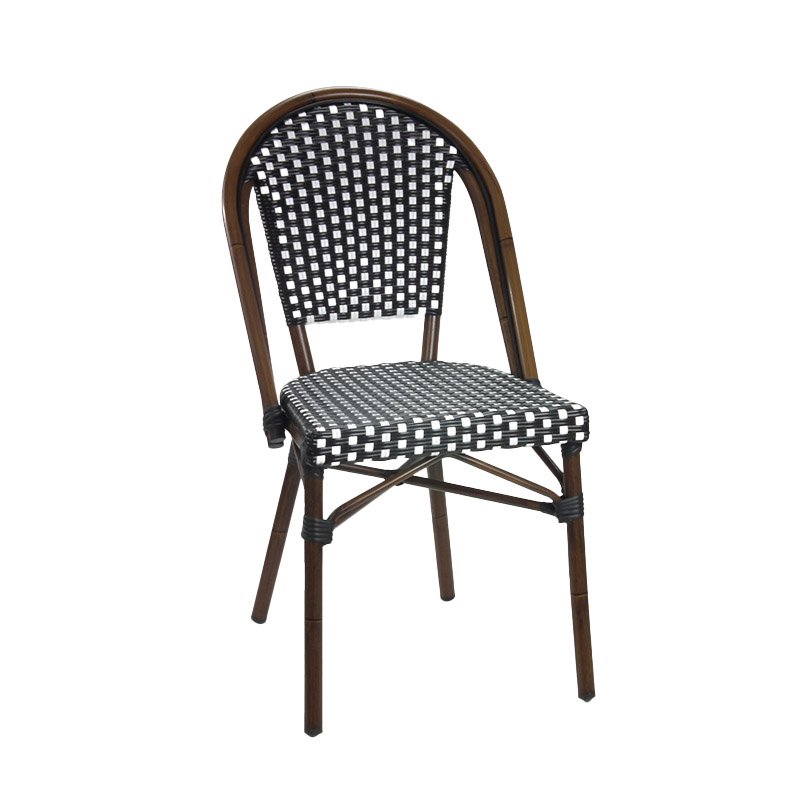 Capture the timeless charm of a French sidewalk bistro with our Rattan Café Synthetic Wicker Chair. Featuring a classic Black & White houndstooth-style weave, this chair brings an air of European elegance to any patio, sunroom, or sidewalk café. While it offers the artisanal look of traditional rattan, it is engineered with high-performance synthetic plastic wicker and a sturdy nylon weave that is specifically designed to withstand the rigors of outdoor commercial use without fraying or fading. The foundation of the chair is a heavy-duty, welded aluminum frame finished in a multi-layered faux walnut powder coat. This innovative finish provides the rich, organic beauty of natural wood grain while remaining entirely rust-proof and weather-resistant. Weighing an ultra-light 8lbs, these chairs are exceptionally easy for staff to stack and move for nightly storage, yet they maintain the structural integrity required for high-traffic environments.