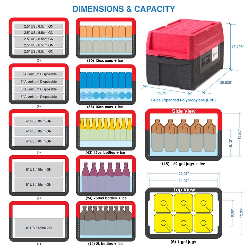 Mightylite BigBoy™ Multi-Purpose Food Carrier, top-load, insulated, (5) pan capacity, holds full, 1/2 & 1/3 sized pans in 2-1/2″ to 8″ depths, (4) integrated handles, stackable, label holder, multi-functional snap seal lid doubles as a server, ultra-lightweight expanded polypropylene construction, black/red (100% recyclable, CFC-free), NSF. 2 year warranty, standard