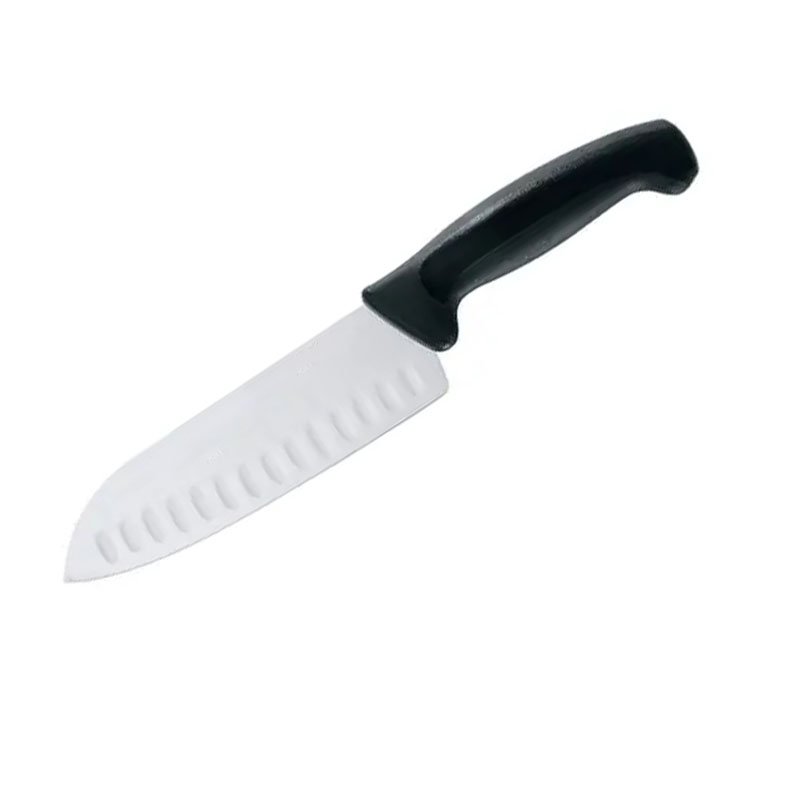 Santoku Knife, 7″, granton edge, high carbon/no stain blade, molded black polypropylene handle, treated with sanitized antimicrobial protection (snap), NSF
