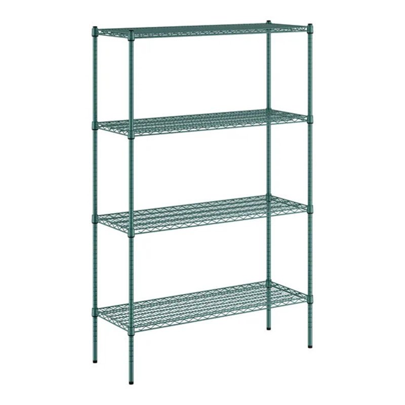 4 Shelf unit, wire, 48″W x 18″D x 74″H, (3) trusses, green epoxy coating, NSF (shelf clips included)