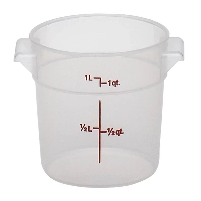 Food Storage Container, 1 qt., round, molded-in capacity indicators, easy-grip handles, spoonable bottom, stackable, dishwasher safe, polycarbonate, clear, NSF, Made in USA