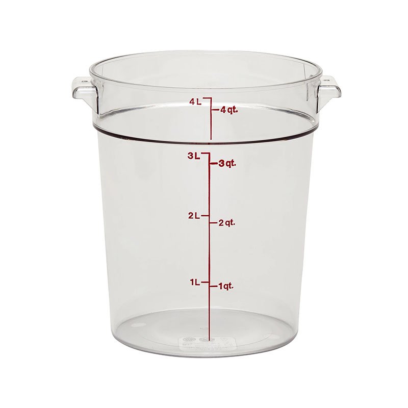 Camwear® Storage Container, round, 4 qt., 8-3/16″ dia. x 8-9/16″H, withstands temperature of -40° F to 210° F, stain resistant, molded-in handle, durable polycarbonate construction, (covers sold separately), clear, NSF, Made in USA