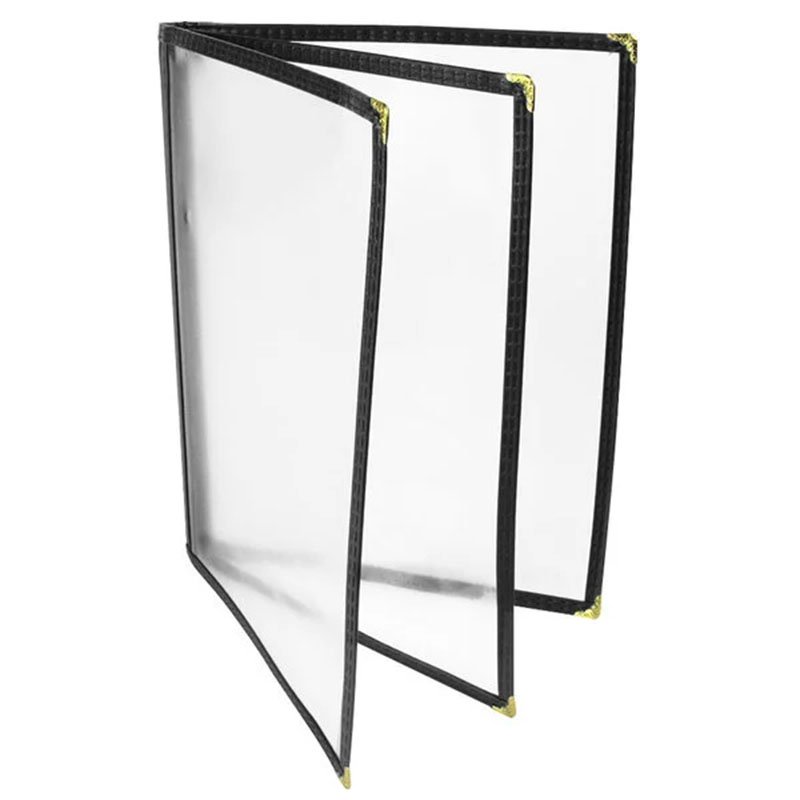 Menu Jacket, holds 8-1/2″, 8-1/2″, 4-1/4 x 11″ inserts, triple pocket with 6 views (right panel at 1/2 width), cafe style, clear sewn edge, crystal clear vinyl, double row of stitching for binding, tucked under edges, crimped metal corners,