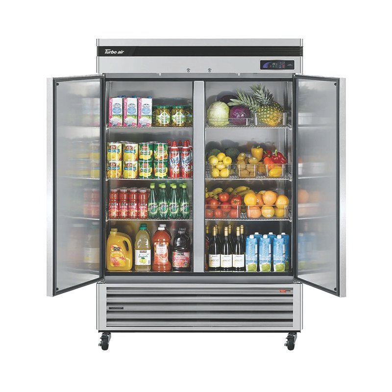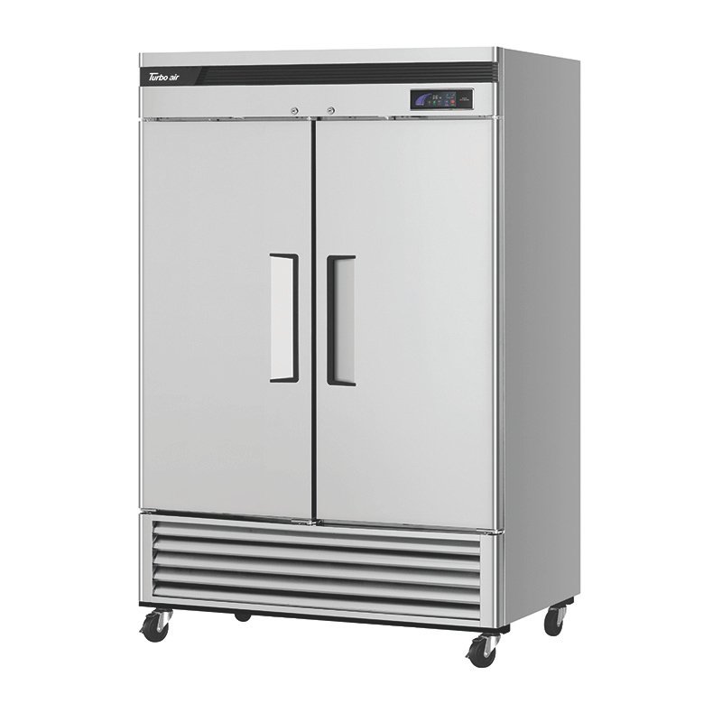 Turbo Air Super Deluxe Refrigerator, reach-in, two section, 42.69 cu. ft. Self-contained, stainless steel front & side, galvanized back & top of cabinet, stainless steel interior, 2 hinged solid doors with recessed handles, LED interior lighting, 6 adjustable stainless steel wire shelves, exterior LED digital thermometer, door-open alarm beeps, self-diagnostic monitoring system, turbo cooling, automatic fan motor delays, door pressure release device, self-cleaning condensor equipped, door locks, bottom mount compressor. R600A Hydrocarbon refrigerant, 1/5 HP, 115v/60/1-ph, 2.3 amps, NEMA 5-15P, cETLus, ETL-Sanitation, Energy Star