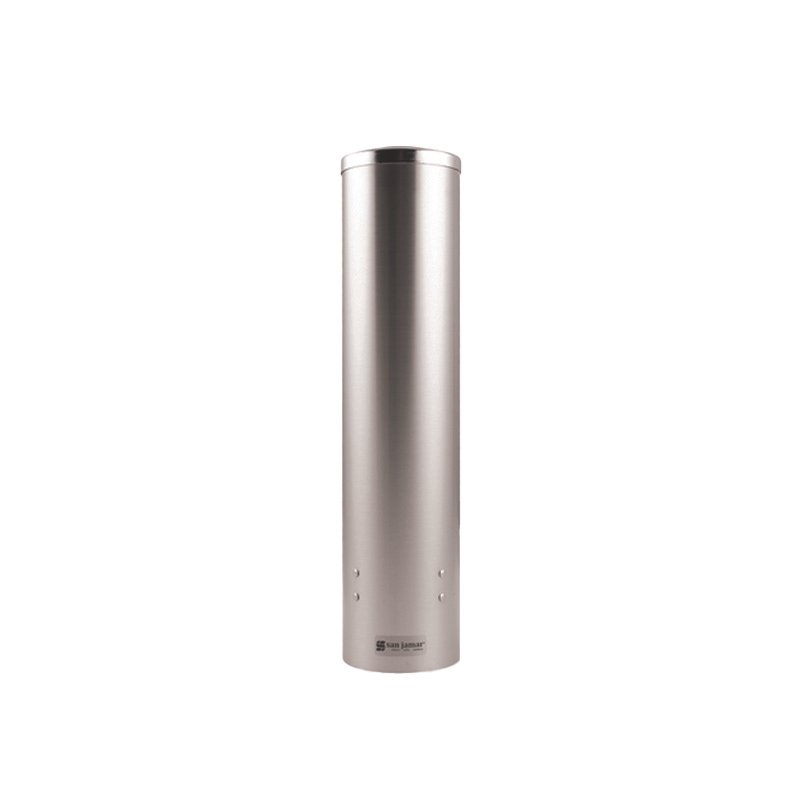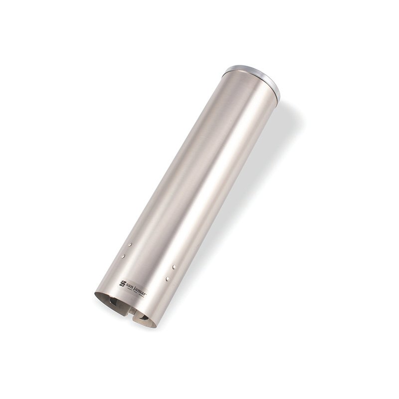 San Jamar – Water Cup Dispenser, large, pull-type, top loading, 16″L tube, fits 4-1/2 oz. to 7 oz. cone cups and 6-12 oz. flat bottom cups with rim diameter of 2-3/4″ to 3-3/8″, 26-gauge stainless steel